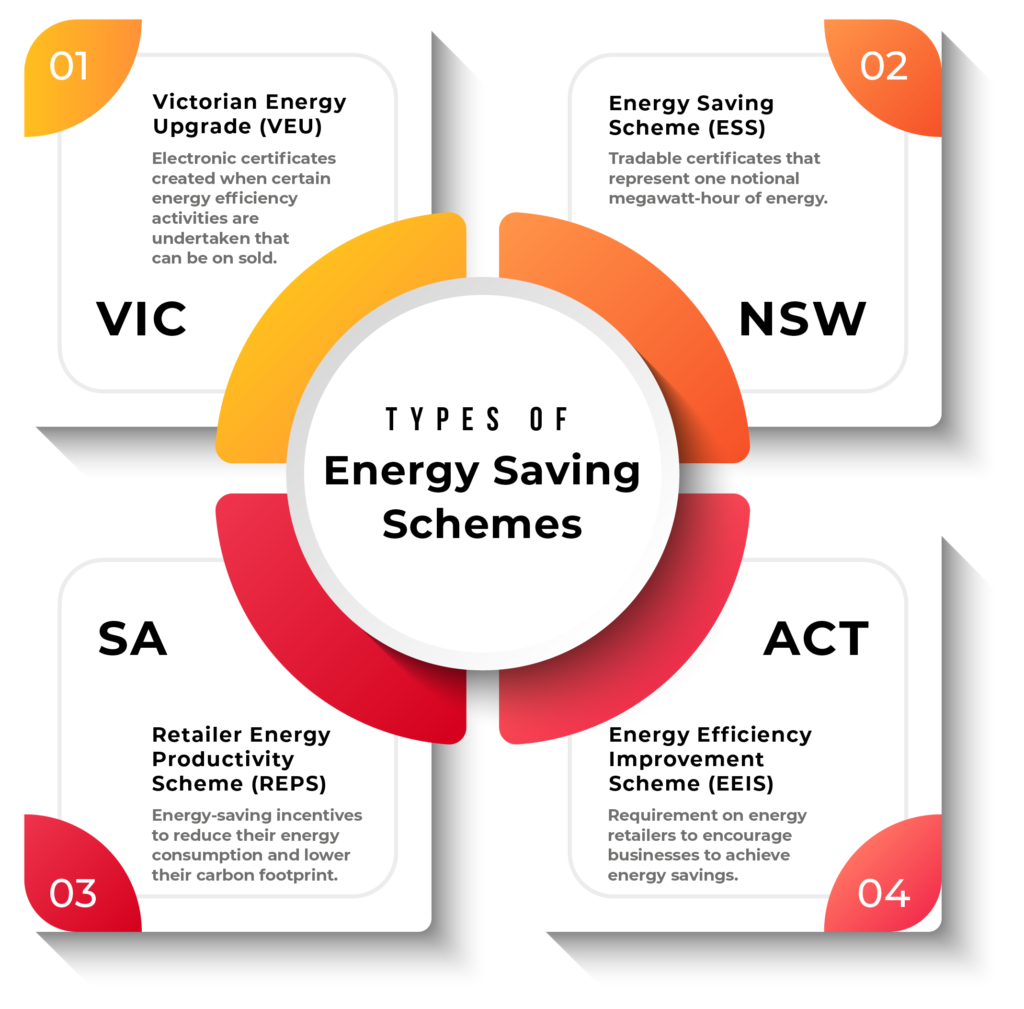 State governments have introduced energy saving schemes to help incentivise businesses to implement initiatives into their business that reduce energy consumption and their carbon footprint. These schemes aim to provide financial benefits such as certificates, rebates, discounts and vouchers for businesses to help lessen the initial financial burden of these energy efficiency investments.